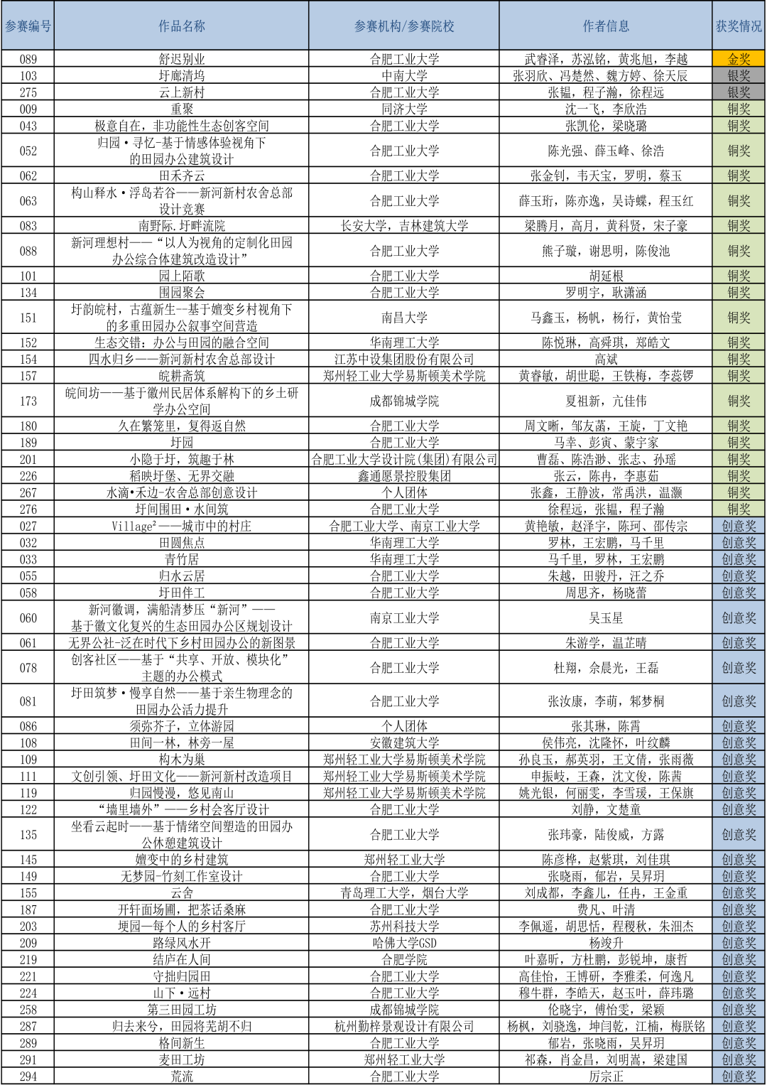 经过评审专家现场数轮投票筛选,最终作品《舒迟别业》获得专家一致肯定,荣获金奖。作品《圩廊清坞》《云上新村》斩获银奖,《重聚》等20份作品获铜奖,《青竹居》等30份作品获创意奖。具体获奖情况见公示附表。